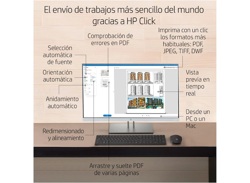 Imprima proyectos de varios tamaños A3 y A0 de forma automática, sin tener que cambiar el origen del soporte manualmente. Ahorre tiempo con el envío de trabajos más fácil del mundo: envíe varios archivos con un solo clic con el software HP Click. Imprima con la seguridad de que obtendrá los resultados que desea, con un controlador intuitivo y una vista previa de la impresión real.